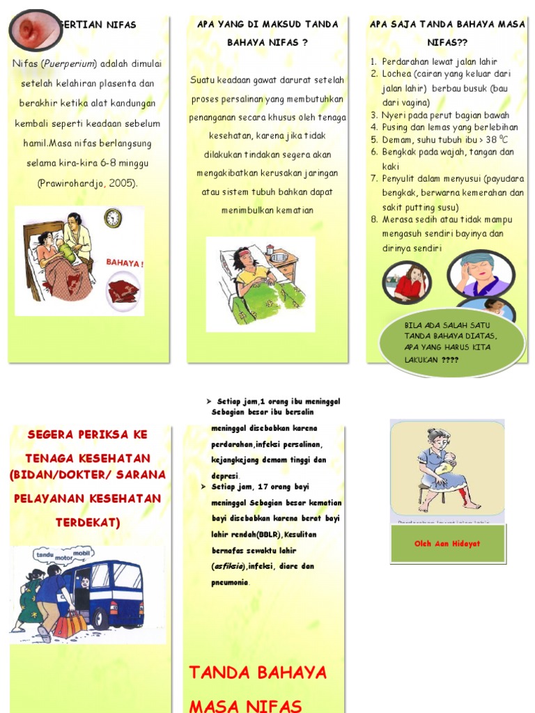 Tanda-Tanda Bahaya Masa Nifas. Selama beberapa hari setelah melahirkan wanita umumnya akan mengalami darah keluar dari kemaluannya. Tanda-tanda bahaya masa nifas sebagai berikut.